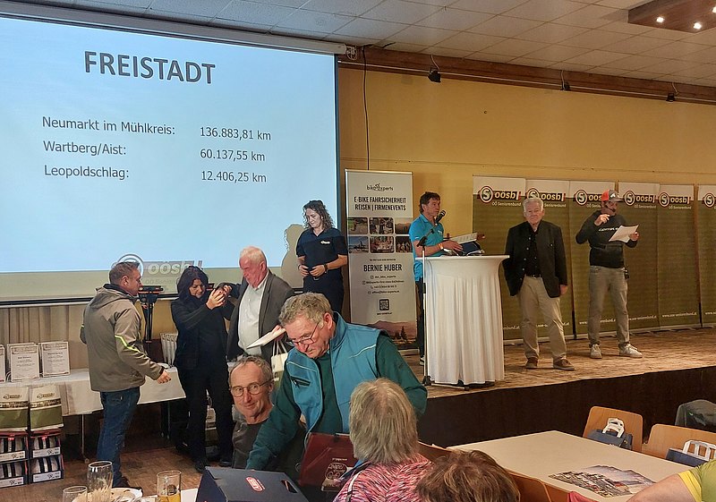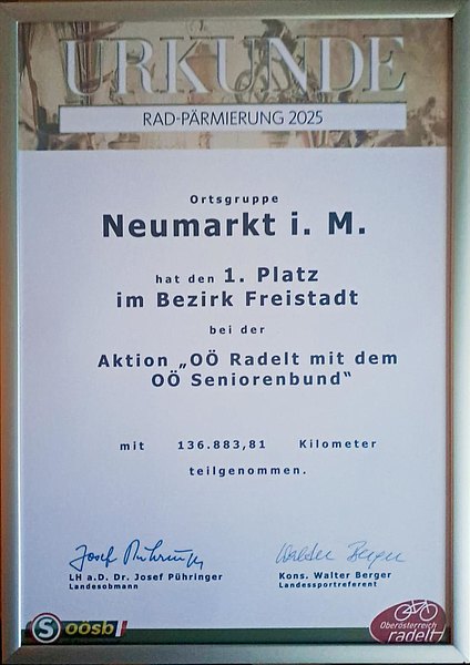 Bei herrlichem Herbstwetter machten sich 33 motivierte Radler auf nach Aspach um dort in uns unbekannter Umgebung eine 42-km-Radtour zu machen und anschließend bei einer Prämierungsfeier geehrt zu werden. Von jedem Bezirk Oberösterreichs wurden die ersten 3 Ortsgruppen jeweis mit Preisen beschenkt. Dabei stach die Ortsgruppe des Seniorenbundes Neumarkt mit überlegener Kilometerleistung von 136.883 und 104 Teilnehmern heraus! Danke allen Teilnehmern, die brav die Kilometer eingetragen haben und zu diesem sensationellem Ergebnis geführt haben.