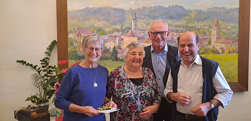 Das Gratulationsteam bestehend aus Obmannstellvertreterin Aloisia Mayr und Beirätin Johanna Narzt stellen sich zusammen mit dem oder der jeweiligen SprengelbetreuerIn mit guten Wünschen bei dem Jubilar, der Jubilarin oder dem Ehejubelpaar ein.